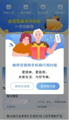 老年客户登录手机银行后自动提示是否切换至“老年版手机银行”,其中使用频次较高的交易查询、转账、理财、缴费充值等功能都已集成于页面显著位置。衡水银行通过“老年版手机银行”解决了老年客群面临的“数字鸿沟”问题,让老年人更好的共享了信息化发展成果, 有效满足了老年群体对安全、贴心、周到的优质金融服务的需求。