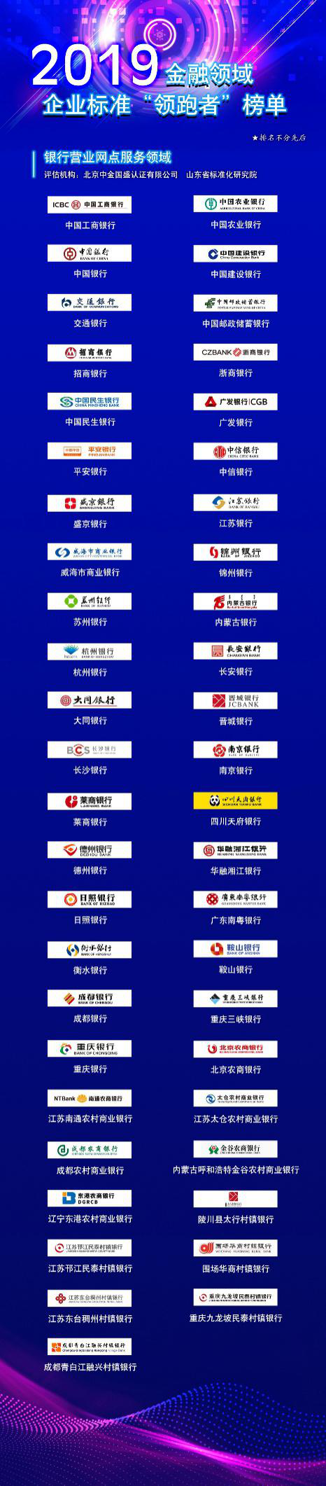 2019年12月20日,中国标准化研究院、全国金融标准化技术委员会秘书处组织中国互联网金融协会、中金国盛认证中心及山东省标准化研究院、人民银行印制科学技术研究所鉴别能力检测中心、中国支付清算协会及银行卡检测中心和中金金融认证中心在北京发布了网上银行服务、银行营业网点服务、清分机、销售点终端(POS)、条码支付受理终端、自助终端(ATM)六大领域的107家企业标准“领跑者”名单。